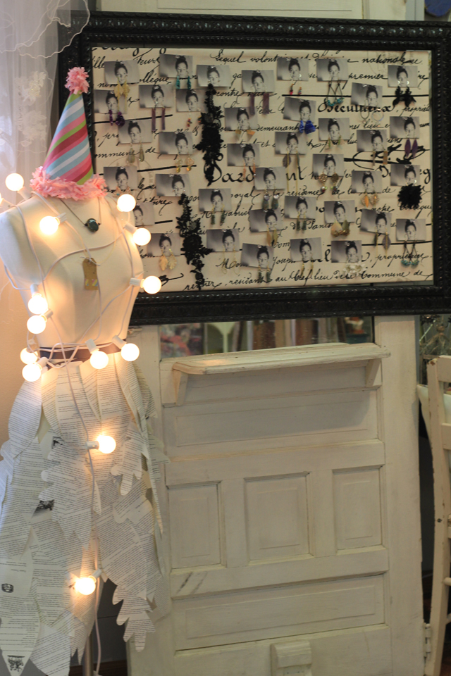 before, i had my earrings displayed on a chicken-wire frame. they seemed to all blend together, so i got excited to try something different. i'm sure, after a while, i'll get sick of looking at my picture and do, yet again, another display. but for now, i like how the cards also list our contact info for the shop. sneaky marketing... that's my game.